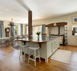 The ground floor is defined by a series of spacious and light-filled reception rooms. The welcoming entrance hall (currently used as a dining room) leads to a formal drawing room featuring large sash windows. The kitchen is the heart of the home, equipped with a traditional oil-fired AGA, central island, and space for informal dining. It flows into a cosy sitting room with a wood-burning stove and delightful views over the gardens —perfect for family living and there is also a games room/play room.