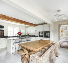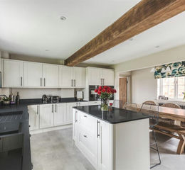 Kitchen Area - With one and a half sink unit with mixer tap, wall and base fitted units with attractive matching worktops, matching kitchen island again with matching worktops, Neff induction hob with extractor hood over, built-in Neff electric fan assisted oven, built-in Neff combination microwave oven with warming plate drawer, integrated Neff dishwasher, fridge/freezer negotiable on sale, matching tiled effect flooring, principle character beam to ceiling, spotlights to ceiling, countryside views, open space leading to dining area, double glazed window, radiator and open space into utility room.