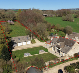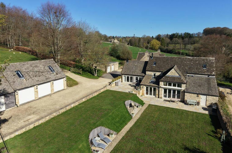 An imaginatively designed and beautifully presented detached Cotswold stone Barn set in a private and elevated position with separate coach house with triple garage and two double bedrooms together with gardens, parking and paddock.