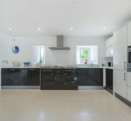 The Corn Barn Ground Floor - The accommodation is centred around the impressive galleried reception room, being open plan with dining, seating and kitchen areas with a stone floor throughout, bespoke lighting, part exposed stone walls and a built in wood burning stove to one end and arrow slit feature windows to the front. The bespoke fitted kitchen comprises a five oven Everhot Range with Miele brushed stainless steel extractor over. Corian worktops throughout with one and a half bowl stainless steel sink unit, a comprehensive range of built in cupboards and drawers, built in Bosch dishwasher, three quarter height central unit with built in refrigerator and built in Neff oven/grill with warming trays below and integral Neff coffee machine. There are further matching units to one side, with a deep breakfast bar with matching worktops and a further range of built in drawers with wine cooler.