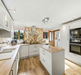 UPVC triple glazed windows x2, door to entrance hall, feature over-counter wall lights, under-counter lighting, ceiling LED light fittings, part-tiled splashbacks, a range of wall and base units with contrasting worktops, NEFF built-in microwave, NEFF integrated double oven, NEFF five-ring induction hob and extractor hood, rangemaster resin inset sink with drainer and high spout mixer tap and waste disposal, Quooker boiling water heater, a range of wall and base units with wooden style worktops, plumbing for integrated dishwasher, wine-cooler, Karndean flooring.