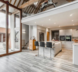• Impressive open-plan kitchen/breakfast/living room showcasing vaulted ceilings, exposed timbers, full-height glazing and a large central island with integrated NEFF appliances