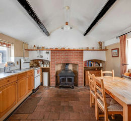 The kitchen reflects the age of the property, with exposed beams, quarry-tiled flooring, and a traditional layout. A walk-in pantry provides useful storage, and French doors open onto the patio.