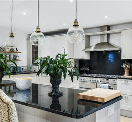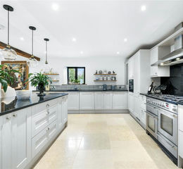 Kitchen with a range of contemporary base and wall units and island with black granite worktops. Rangemaster infusion stainless steel range with electric ovens, gas hob and hood over. Inset microwave/combination oven, wine cooler, larder fridge, larder freezer , dishwasher and washing machine and dryer. Large seating/dining area and storage cupboard.