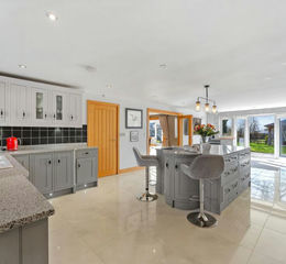 From beneath the shelter of the oak porch, ornate oak double doors, each inset with a half-moon window, open into a welcoming entrance hall where gleaming porcelain tiles stretch out underfoot. Warmth emanates throughout, with underfloor heating featured across both levels. Light and bright, neutral, elegant décor sets the scene for a home as stylish as it is inviting.