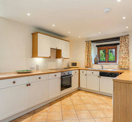 A lawned courtyard to the front provides a delightful spot for morning coffee, with a pathway leading into a spacious open-plan living area. Inside, exposed beams and a centrally positioned wood-burning stove create warmth and character, while the generous kitchen and dining space offers ample worktop and storage, perfect for both everyday living and entertaining. A downstairs WC and an external door opening onto woodland views complete the ground floor.