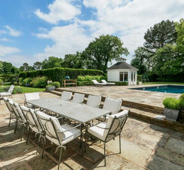 The house has two sets of gates, one central and leading to a huge gravel forecourt and turning area suitable for an extensive number of guests. The gardens immediately surrounding the house are beautifully manicured with topiaried yew hedging, flowers and shrubs and a number of ancient trees. A York stone terrace wraps around the house to the side and rear and runs flush to the interior of the new extension, beyond which is a large pool deck with summer house and an outdoor heated swimming pool run by an air source heat pump and electric cover.