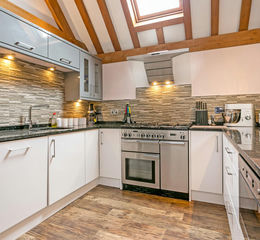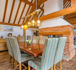 The owners have always enjoyed the lifestyle element the property and location provide, being so close to the river and Thames pathway opens up paddle boarding and extensive walks on the doorstep. The front door to this well appointed barn opens into the reception hall, with access to the open plan kitchen and living space, bedrooms 2 and 3, cloakroom and stairs up to the principal bedroom. A main feature of this property is the generous, open plan living space based around the central open fireplace with log burner. The well appointed kitchen is to the side with a range of integrated appliances including range cooker, fridge/freezer, dishwasher and wine fridge. There are granite worktops. This super space has all the features you would expect of a barn with exposed beams and brickwork with the central chimney and wood burner, there is also underfloor heating throughout the space which continues through the hallway. There are 3 sets of French doors leading out from the living space to the garden. Completing the ground floor accommodation are two double bedrooms both with ensuite shower rooms. On the first floor is the principal bedroom with ensuite bathroom and an array of built in bedroom furniture including built in wardrobes, there are Velux skylights on both sides.