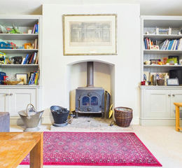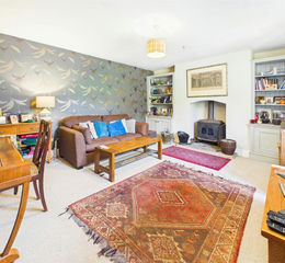 Sitting Room - 5.28m x 4.39m (17'4" x 14'5") - A beautifully presented reception room overlooking the garden, complete with bespoke built-in display units and a charming fireplace with inset wood-burning stove set on a stone hearth, perfect for cosy evenings.