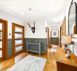 A delightful L shaped reception hall with attractive oak finishes, painted wood panelling to dado height, in soft green and solid oak flooring. There is a large storage cupboard with sliding oak doors, and a further single cupboard.