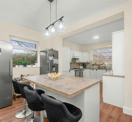 Kitchen/Dining Area - 6.15m x 4.83m (20'2 x 15'10) - UPVC double glazed window, hardwood double glazed window, central heating radiator, a range of white panelled wall and base units, granite effect surface, tiled splash backs, composite one and a half sink and drainer with a five ring gas hob and extractor hood, integrated fridge freezer, dishwasher and washing machine, counter island, breakfast bar, under stairs storage cupboard, wood effect laminate flooring, door to the utility room.