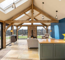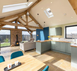 Enjoying a south-facing orientation, Oak Tree Cottage is flooded with copious amounts of natural light, the centrepiece being a large open-plan living space, which shows off its oak frame and features floor to ceiling windows on three sides and a wood burning stove.