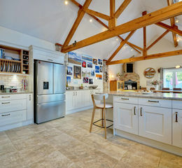 Towards the end of the entrance hall, the home opens into a main reception hall. To the left is a spacious office or study, perfect for home working. To the right, there is a modern downstairs WC and a separate, well-proportioned utility/laundry room. Continuing through, the current owners have thoughtfully added a separate pantry cupboard, providing excellent additional storage. The ground floor is completed by the bright and spacious open-plan kitchen and dining area, ideal for entertaining family and friends, while still retaining charming period features. Patio doors lead directly from this space out into the private, fully enclosed rear garden.