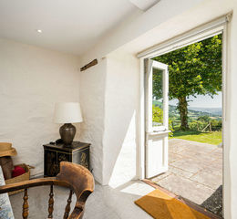 Step through the painted wooden front door into a welcoming vestibule providing access to the fabulous, light farmhouse style kitchen/dining room with painted stone walls and beams. The kitchen area comprises a range of quality, modern bespoke painted cupboards and a useful island. The granite worksurfaces contrast with the soft painted doors and wrought iron handles. A decorative tiled alcove houses a Falcon range cooker with chrome fittings and concealed cooker hood and lighting over. The kitchen has been thoughtfully designed to not only provide an aesthetically pleasing area in which to enjoy the views to the rear but to maximise the enjoyment of cooking and entertaining. To the rear of the kitchen is ample space for a substantial dining table and chairs, a half glazed door opening onto the terrace with views across the valley. Aside from the dining table there is plenty of space for a sofa or armchairs.