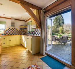 THE PROPERTY Head in to this lovely property, where there is a warm and welcoming traditional farmhouse kitchen, full of rustic charm and character. Featuring classic cabinetry, built-in double oven and separate ceramic hob with an extractor over, the space is both functional and full of appeal. Exposed beams and tiled flooring add to the authentic country feel, while dual aspect windows bring in plenty of natural light. This is the heart of the home - perfect for family life or entertaining - with ample space for food preparation, storage, and casual gatherings. Just outside is a sheltered patio area offering the perfect spot for morning coffee or evening dining - surrounded by the peaceful sounds of nature and open views of the countryside.