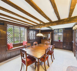 As you step through the front door you are instantly immersed in historic character and splendour merged effortlessly with modern decor. Beams and original tile flooring greet you in the spacious hallway which opens onto the main dining room with floor to ceiling oak panelling, beams and open fire. Across the hall is a sumptuous bright lounge, with beams, modern solid wooden flooring and log burner for cosy nights. Moving along there is a utility room, and also a kitchen /breakfast room leading onto a further spacious family room with inglenook fireplace.
