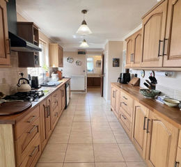 With double belfast sink. Radiator. Plumbing for washing machine. Extractor fan. Solar panel controls. Part tiled walls. Tiled floor.