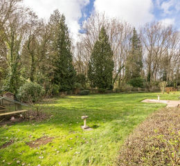To the left, the bank gently slopes away, elegantly landscaped with planter beds to either side of which are purpose-built steps, with the balcony running around the house. At the bottom is the most serene and peaceful of gardens. Several sheds and a chicken run are almost lost in an expanse of lawn that is broad, edged with simple post and rail fencing, outside which is a lovely array of mature trees and hedges on the neighbouring land.