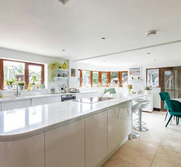 Matching range of base unit. Inset single drainer 1.5 bowl sink unit. Granite work surfaces. Large island unit with inset electric hob and two built-in fan assisted electric ovens below, granite top, breakfast bar area. Integrated dishwasher and washing machine. Window to front overlooking garden. Large corner window. Downlighters. Tiled floor with underfloor heating. Double doors to covered seating area. Picture window to rear with far reaching views across the estuary. Double doors to rear garden.