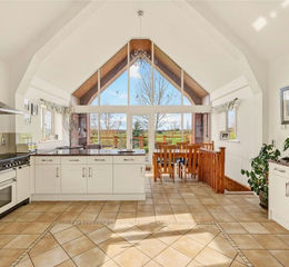 • Stairs lead up to a raised kitchen featuring a fully vaulted ceiling and stunning full-length windows that offer incredible views over the balcony and to the countryside beyond. The modern kitchen features integrated appliances, a Rangemaster cooker, granite worktops, a breakfast bar, and a dedicated dining area.