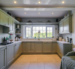 Kitchen - 4.50m x 3.40m (14'9" x 11'1") - Window to the front elevation and fitted with a range of painted units with quartz worktops and matching upstands. Inset sink unit, gas hob with extractor hood, built in oven and grill, integrated dishwasher and ceramic tiled flooring. Matching dresser unit.