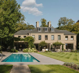The rear gardens are a particular highlight, designed by Zoe Cleary Design. They have been laid out with structure and maturity rarely seen in newer homes. Formal terraces lead out from the house, creating perfect spaces for outdoor dining and entertaining. A heated 20m lap-pool, sits centrally to the loggia flanked by lawned gardens and framed planting, while a charming Alitex Glasshouse and kitchen garden beyond, provides a focal point and sense of depth to the plot. Nestled in the rear of the garden beyond the estate fencing is a 3-point basketball court and fire pit area for outdoor entertainment.