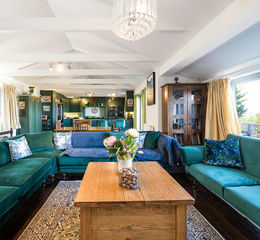 At one end of the open-plan expanse lies the generous and recently upgraded kitchen, with new kitchen doors, pelmets and kickboards installed in 2025 and sourced from Wren. Elegant emerald green shaker-style cabinetry is complemented by granite worktops. Appliances include a Rangemaster cooker set within a grand alcove, a Blomberg double oven, a Beko induction hob, an integrated Beko dishwasher, integrated wine cooler, alongside housing for an American-style fridge-freezer. Generous preparation space completes this well-appointed culinary hub. On the opposite side of the double-sided fireplace, a versatile triple-aspect room offers a wealth of possibilities. Bathed in natural light, it could be a private reception room, while a subtle elevation change creates a second zone-ideal for use as a study, an office, and a music room. Alternatively, this adaptable space could function as an additional bedroom.