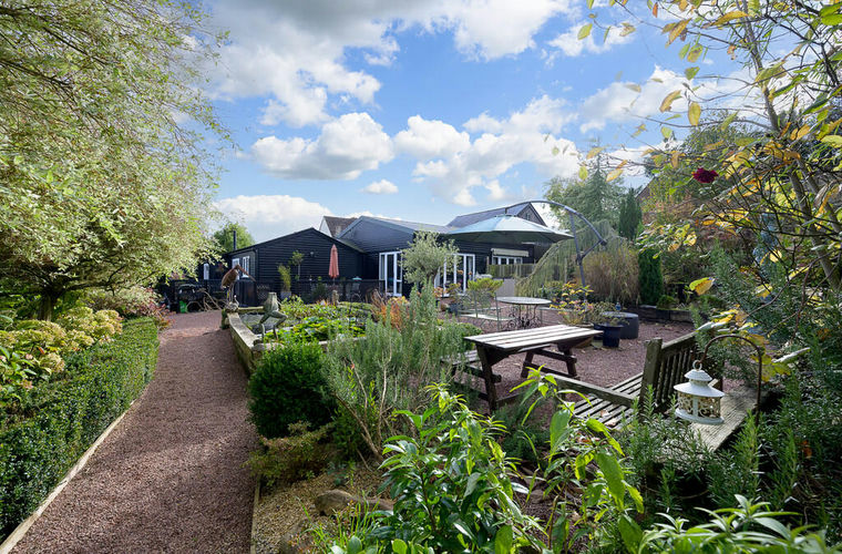 Outside, the garden offers a private and highly desirable country retreat. A wooden deck provides the perfect vantage point from which to admire the sublime pastoral views, while the grounds surrounding Walnut Barn are equally captivating, framed with roses and lavender, a large raised fishpond sits at the heart of the garden, encircled by a gravel path and complemented by raised beds made from vintage wooden sleepers, planted with an engaging variety of shrubs and seasonal blooms. For those with green fingers, a new greenhouse and raised-bed kitchen garden provide excellent opportunities to grow fresh produce. Espaliered pear trees, dwarf apple and plum trees, and rose bushes are planted in raised beds. A separate cutting garden has been planted to cultivate flowers to enjoy indoors. Alongside the small lawn, a good sized vegetable garden with raised beds has also been created, through an archway of blue and white wisteria, leading to productive pear trees and roses, alongside fruit bushes and herbs. Thoughtfully arranged and beautifully maintained, the garden offers year-round interest and tranquillity.