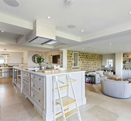 To the rear of the property is an impressive open-plan family living/dining kitchen, fitted with bespoke units by Ian Watkinson, quartz worktops and high-quality integrated appliances large central island with breakfast bar, alongside a dining area with built-in seating.