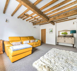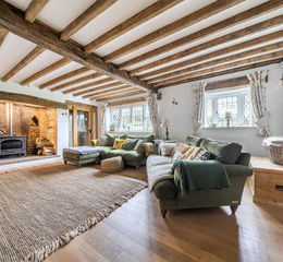 • Superb kitchen/dining room with tumbled limestone flooring and underfloor heating, bespoke Howdens kitchen fitted in 2019, quartz work surfaces with inset 1½ bowl stainless steel sink unit and integrated 4-ring hob with comprehensive range of cupboards and drawers beneath including integrated dishwasher and bin storage. Full height larder cupboard, full height fridge and full height fridge/freezer. Two Neff ovens, both with grills. 2-oven electric Aga inset into fireplace recess with oak beam above. Breakfast bar with cupboards below and wine fridge. Part vaulted ceiling with feature exposed oak beams. Stable door to the front garden. An opening leads into the spacious double aspect dining area with a bow window overlooking the terrace and rear garden. Inglenook fireplace with oak beam, slate hearth and wood burning stove. The dining area opens into the rear hall with oak door to the terrace and garden and a further glazed door to the sitting room.