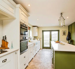The kitchen comprises of tiled flooring, ceiling spotlights, radiator, matching wall and base units with granite worktop over, integrated appliances, double Belfast sink with drainer, electric oven, double glazed window to the side elevation, double glazed French door to the rear elevation.