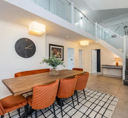 The main rear entrance opens into an impressive double-height dining hall with a seating area and galleried landing - an appealing living space ideal for entertaining.