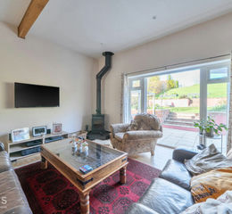 The adjoining lounge area is equally inviting, featuring a woodburning stove with slate hearth, wooden flooring, and further patio doors that flood the space with natural light while providing seamless access to the garden — ideal for both relaxing and entertaining.