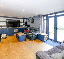 Lounge - 5.46m x 3.76m (17'11" x 12'4") - The super spacious lounge has an oak floor, down lighters and fitted storage to the media wall. Glazed doors open to the garden with stunning far reaching views. Steps lead down to the breakfast kitchen.