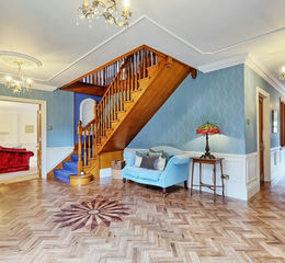 ENTRANCE HALLWAY A truly impressive reception space, designed to set the tone for the entire home. The hallway is flooded with natural light via striking floor-to-ceiling double-glazed windows to the front elevation. Amtico flooring runs underfoot, complemented by decorative coving, two elegant ceiling roses, and detailed wall panelling. A beautifully crafted oak staircase rises to the first floor, while multiple storage cupboards are discreetly integrated, combining practicality with style.