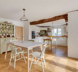 Furlong House is a former 19th century cottage that was sympathetically extended and modernised by the current owners in the 1990s to create a delightful family home, just three miles from Sherborne. Entering via the solid oak front door into a spacious hall with attractive parquet flooring, one immediately gains a sense of the period character of the house, which permeates throughout. The hall leads into a dual aspect dining room with original flagstone floors, a pretty Victorian tiled fireplace and French doors onto the terrace. Adjacent, the spacious drawing room enjoys a triple aspect, thus benefitting from sunlight for most of the day, with a very deep inglenook fireplace housing a wood burner. A well-lit study lies at the end of the house, fitted with bookshelves and looking out onto the garden. The light and airy farmhouse style kitchen/diner forms the heart of the home, fitted with painted base and wall units, wooden work surface, porcelain 1 ½ butler sink, five ring gas hob, Neff double eye-level oven, fitted full-length fridge and recess for a dishwasher. There is also a pantry and a generous dining area with French doors leading onto the terrace providing the ideal spot to spill out onto on those warmer evenings. A well-appointed utility room with WC along with a separate cloakroom off the hall complete the ground floor accommodation.