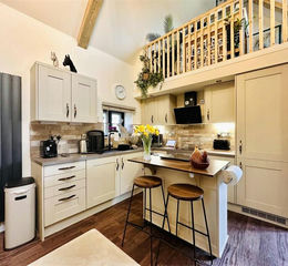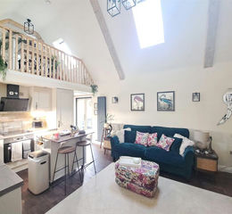 Accessed via a solid wood entrance door, this impressive open-plan space features a vaulted, beamed ceiling and a mezzanine level above, ideal as a home office or occasional sleeping area, accessed via a pull-down staircase.