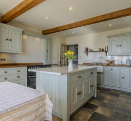 To the rear, the south-facing kitchen enjoys wonderful natural light and spectacular views across the surrounding countryside. Fitted with a bespoke Drew Forsyth kitchen, the space is both beautiful and practical, with warm wooden cabinetry, open shelving, a Belfast sink, and a full-height larder cupboard. A Rangemaster cooker and multi-fuel stove add further character, while French doors lead directly onto the garden terrace – a perfect place to enjoy the stunning outlook.
