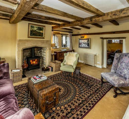 The principal living room is both elegant and inviting, featuring stone mullioned windows, exposed beams and far-reaching views across the valley. A feature fireplace with wood-burning stove forms a cosy focal point.