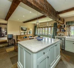 The heart of the home is the impressive open-plan kitchen dining room, designed with both everyday living and entertaining in mind. Beautifully appointed with handcrafted cabinetry, granite worktops and a central island, the space is enhanced by stone flagged flooring and exposed beams.
