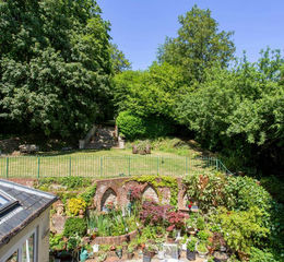 Outside and to the rear of the house is an attractive and generous sun terrace with a feature pond and gothic arches set within the brick retaining wall. Pathways lead round either side of the house providing access. Steps lead up from the terrace to the flat croquet lawn which is perfect for entertaining beyond which elegant Purbeck stone steps lead to the orchard and upper lawn area.