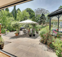 Lovely wrap around Amdega orangery‚ electric Velux skylights‚ ceiling fan‚ fitted blinds‚ engineered oak floor with under floor heating throughout library and kitchen.