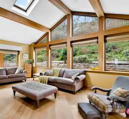 Internally, the home is rich in character, with exposed original beams, thick walls, oak flooring, vaulted ceilings and beautifully designed living spaces. The hand-painted oak kitchen with granite worktops and breakfast bar sits at the heart of the home, while the rear extension provides a stunning vaulted living space with an Austroflamm wood burning stove. The former wood store now creates a striking summer room with aluminium sliding doors and an inbuilt log burner, giving the room a cosy feel all year round, even when the landscape outside is covered in winter snow. The main open living space is perfectly positioned to enjoy breathtaking views towards Bouldsworth Hill and beyond. Upstairs, the principal bedroom benefits from a fully tiled wet room style en suite, a further bedroom has its own shower facilities, and a family bathroom serves the remaining rooms. Every bedroom enjoys unreal views.
