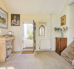 The tone is set in the entrance hall with vaulted ceilings, exposed beams and French windows beckoning through and drawing attention to the rear terrace and gardens. To the left is the triple aspect sitting room. With wintery focus on a fabulous fireplace with log burner, and in the warmer months attention shifting to the south-facing gardens with direct access via pretty French doors. Above the sitting room sits the guest wing with a comfortable bedroom and bathroom providing a private retreat and accessed via a staircase built from reclaimed wood. To the right of the entrance hall is a charming rustic kitchen. With wood flooring and an eclectic mix of furnishings creating a very warm and functional space. The kitchen truly is the heart of this home with it serving as the focal point for accessing the conservatory and gardens beyond, the utility room / cloak room and the more formal dining room to the front of the property.