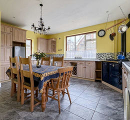 At the heart of the home is an impressive 28 ft sitting room, featuring a striking inglenook-style fireplace crafted from Cotswold stone with an oak beam. French doors open out to the garden, while a beautifully crafted oak staircase leads up to a mezzanine landing on the first floor accessing the main bedroom and a further guest suite. The ground floor also includes a well-appointed country-style kitchen/breakfast room, a separate dining room or cosy snug, a practical utility room/second kitchen and boot room.
