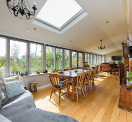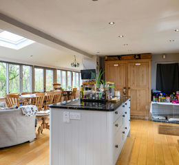 The property opens into a welcoming entrance hall with parquet flooring and access through to the principal reception spaces. The accommodation is both generous and flexible, comprising three reception rooms including a formal sitting room with multi fuel stove, a dining room and a further family room, providing the 'wow factor', stretching across the rear with doors opening onto the garden. In addition, there is a study and a music room, offering ideal spaces for home working or hobbies. The kitchen is well appointed with a range of units, central island and oil-fired Aga, with ample space for appliances, and leads through to a practical utility room, pantry and WC.