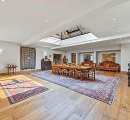 The property offers extensive accommodation over two floors, with a striking reception room at its heart, currently used as a formal dining room and entertaining space with a large central roof lantern flooding the space with natural light. The room has beautiful solid wood flooring and a Sonos sound system, ideal for entertaining on a grand scale, reminiscent of a bygone era.