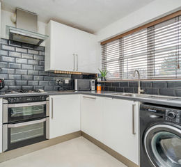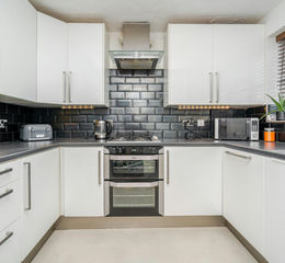 As you step inside the property, the kitchen is on the right. This modern space features sleek white gloss units, complemented by a contrasting black worktop and stylish metro tile splashbacks. There is ample storage, along with integrated appliances including a dishwasher, double oven, and gas hob, plus space for a freestanding washing machine and fridge freezer.