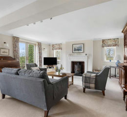 Sitting Room - 6.54m x 5.46m (21'5" x 17'10") - Dual aspect with twin double glazed window to rear overlooking the gardens and paddock, double glazed window and double glazed French doors to side with panoramic views over the gardens and along the Malvern Hills, coving, six hall light points, ornate fire surround with floor mounted wood burner, slate hearth, three radiators, glazed double door to: