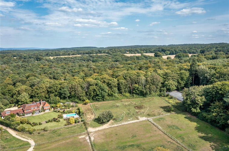 Set in the Surrey Hills Area of Outstanding Natural Beauty, a stunning substantial Arts & Crafts style house with equestrian facilities, the whole enjoying views to the west / south west over mature gardens and paddocks.
